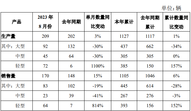 亚星客车9月5日公告,公司8月份汽车销售量达170辆,同比增加15.00%。本年累计汽车销量1105辆,同比增加6.00%。