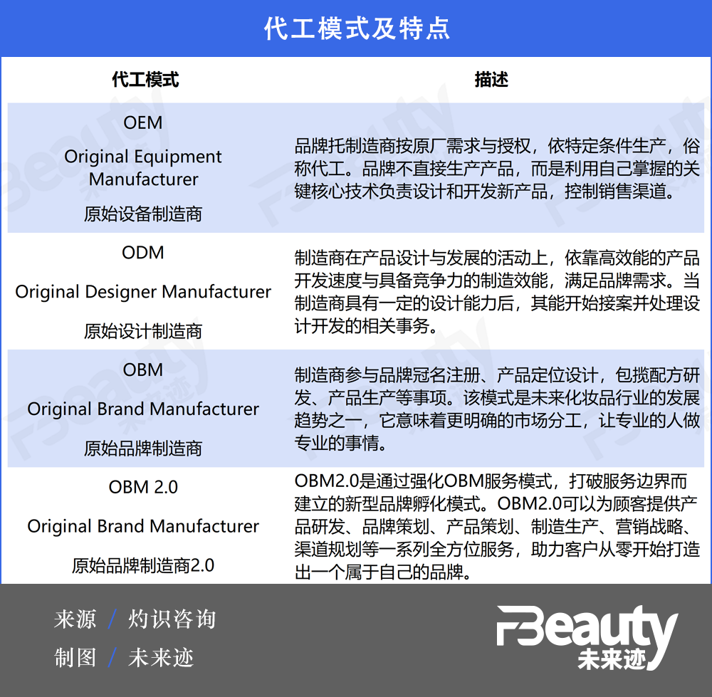 而OBM及OBM 2.0模式则是在代工之外,为客户提供品牌策划、产品研发及营销战略等一系列全方位的服务,科丝美诗、全丽等企业都有提供相关服务。