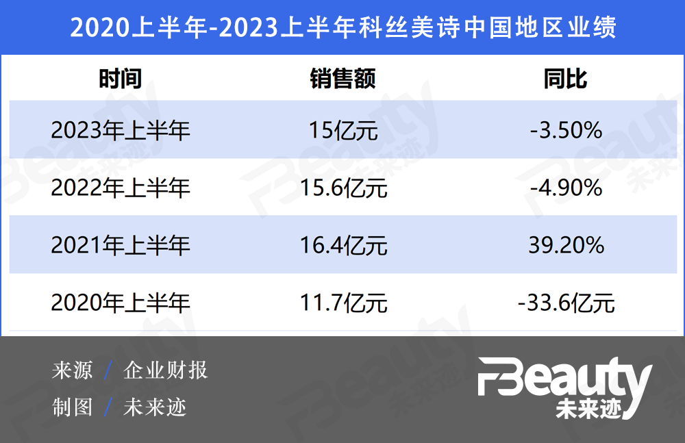 科丝美诗公布的2023年上半年财报显示,上半年其全球营收增长至47.91亿元,创近5年同期新高。但就中国市场来看,上半年科丝美诗在中国的销售额同比下滑3.5%至15亿元,尽管第二季度同比增长了12%,至8.35亿元,但依旧未能全部抵消一季度的下滑。