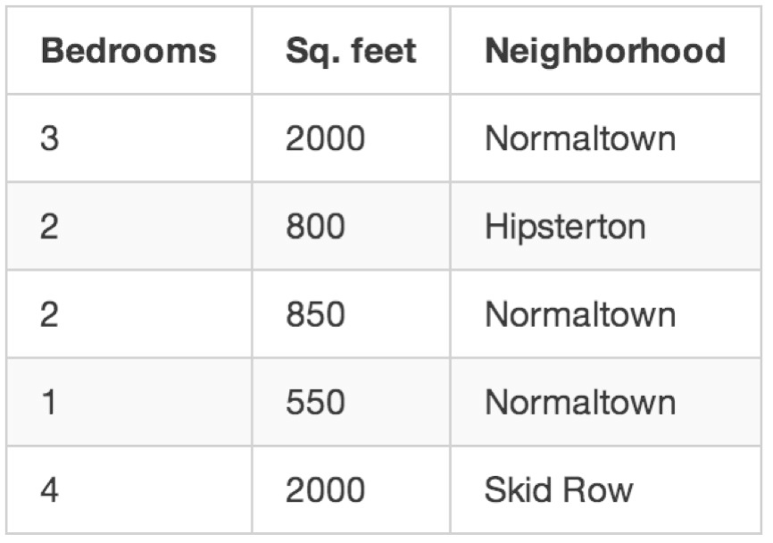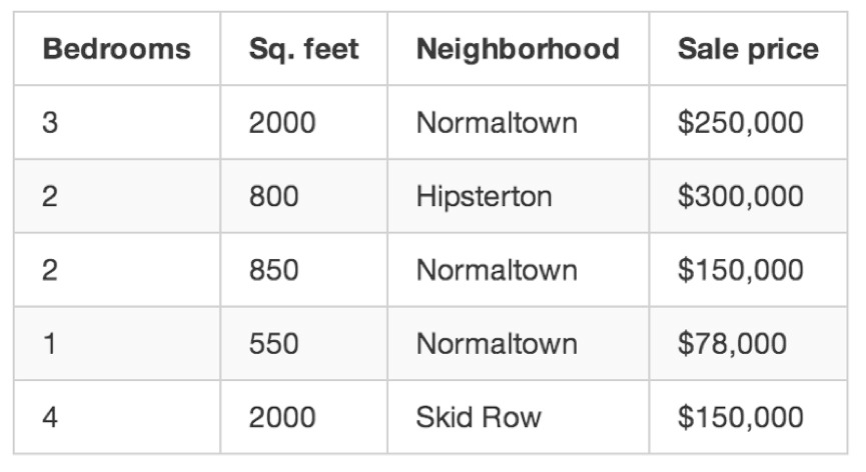 因此,你需要记录下你所在城市三个月内房产交易的信息。针对每笔交易,你需要记录下一系列细节信息,比如:房间数目、房子大小、周边地区环境,等等,最重要的是要记录下交易的最终价格。