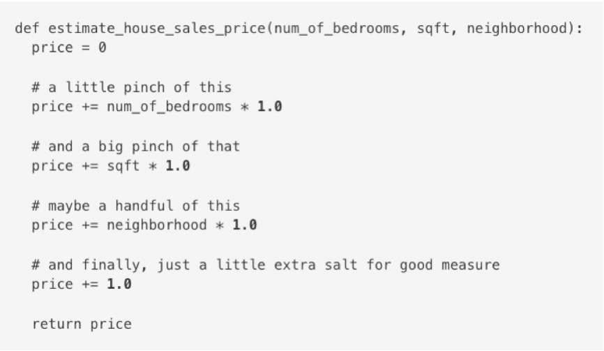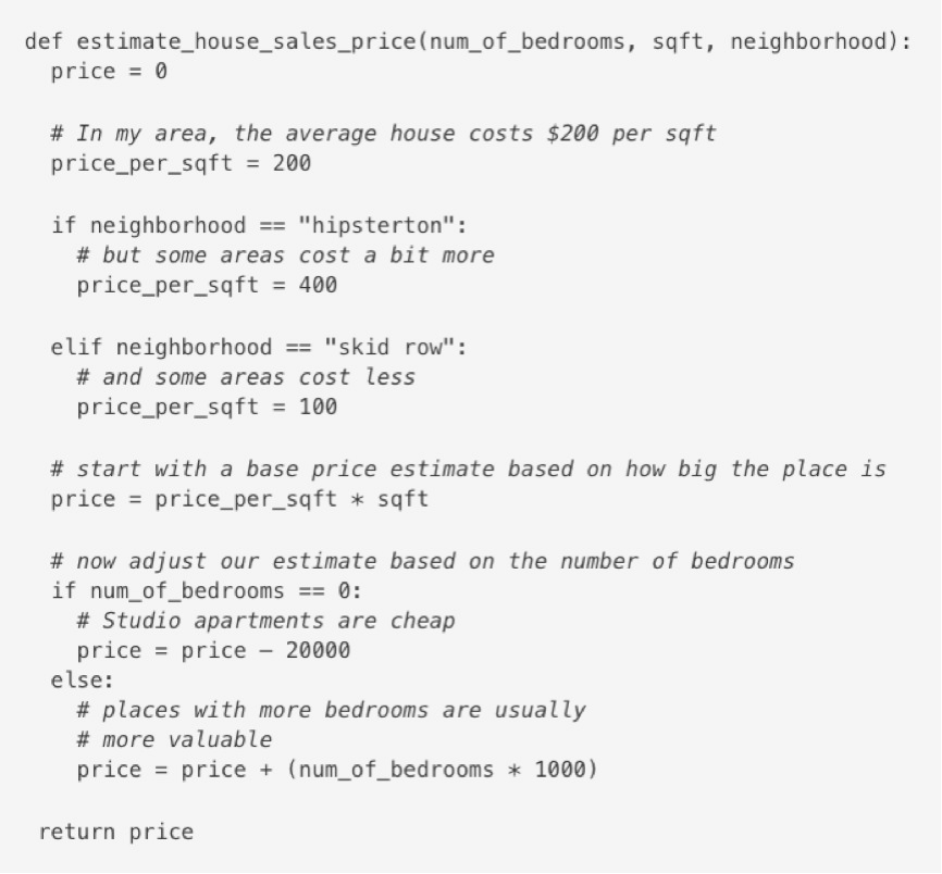 假设你现在对“机器学习”一无所知,你大概会写一些房屋估价相关的一些基本规律和规则吧?就像这样: