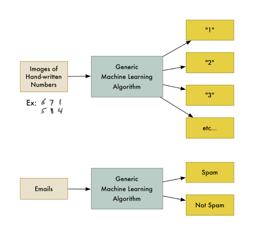 举个例子:用于分类的泛型算法是能够把一组数据分门别类的,用于识别手写数字的分类泛型算法同样能够做到在不改变代码的条件下将垃圾邮件和非垃圾邮件区分开。两者使用的是同一种泛型算法,但是因为输入的数据不同,所以输出的分类逻辑是不一样的。