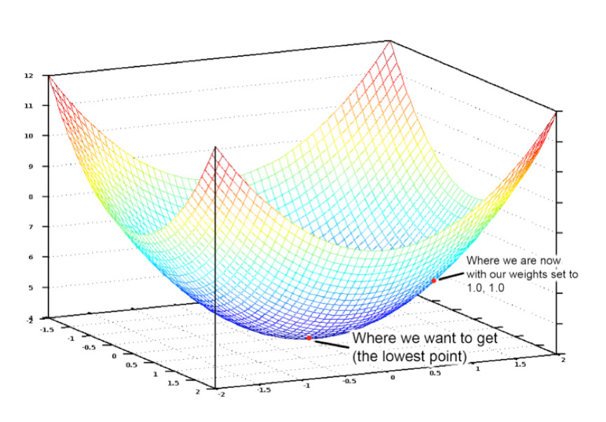 如果你还记得微积分学的一些知识的话,你应该会记得如果你求出了函数的导数,就相当于知道了这个函数在各个点的切线斜率。换句话来说,就是知道了哪个方向角度能使我们在图像上呈下降趋势,我们可以借助这些知识来接近图像最低点。