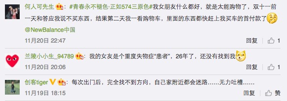 这次的情感营销更强调和消费者的互动。比如New Balance在微博微信上发布“我的强迫症男友”和“我的失物症女友”为主题的16张四格漫画,并邀请受众分享自己的故事,参与到互动话题讨论中来。