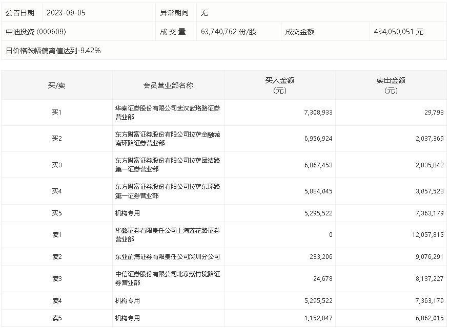 9月5日,中迪投资今日跌停,龙虎榜数据显示,上榜营业部席位全天成交8518.07万元,占当日总成交金额比例为19.62%。其中,买入金额为3372.36万元,卖出金额为5145.71万元,合计净卖出1773.34万元。