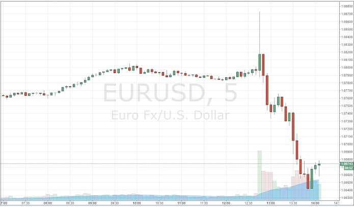 欧洲央行公布货币政策决定后,欧元兑美元大幅波动。FXCM数据显示,欧元最初一度涨至1.0873美元,创出三周高点。随后欧元迅速下挫,跌破1.07美元,盘中低点见1.064美元。