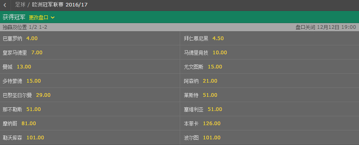 根据欧洲专业博彩公司公布的最新夺冠赔率,巴萨以1赔4的赔率排名榜首,而拜仁(1赔4.5)和皇马(1赔7)虽然小组第二出线,但依然被公认为是仅次于巴萨的夺冠热门,三支球队也组成了争冠的第一集团。在第二集团中,马竞1赔10排名第四,曼城、尤文和多特蒙德紧随其后,而阿森纳虽然本赛季表现出色,欧冠和联赛齐头并进,但欧冠夺冠赔率(1赔21)只排在第8位,不知今年教授能否带领枪手摆脱“欧冠16郎”的命运。此外,莱斯特城以1赔51的赔率位列中游,博彩公司认为“蓝狐”依然存在继续创造奇迹的可能。