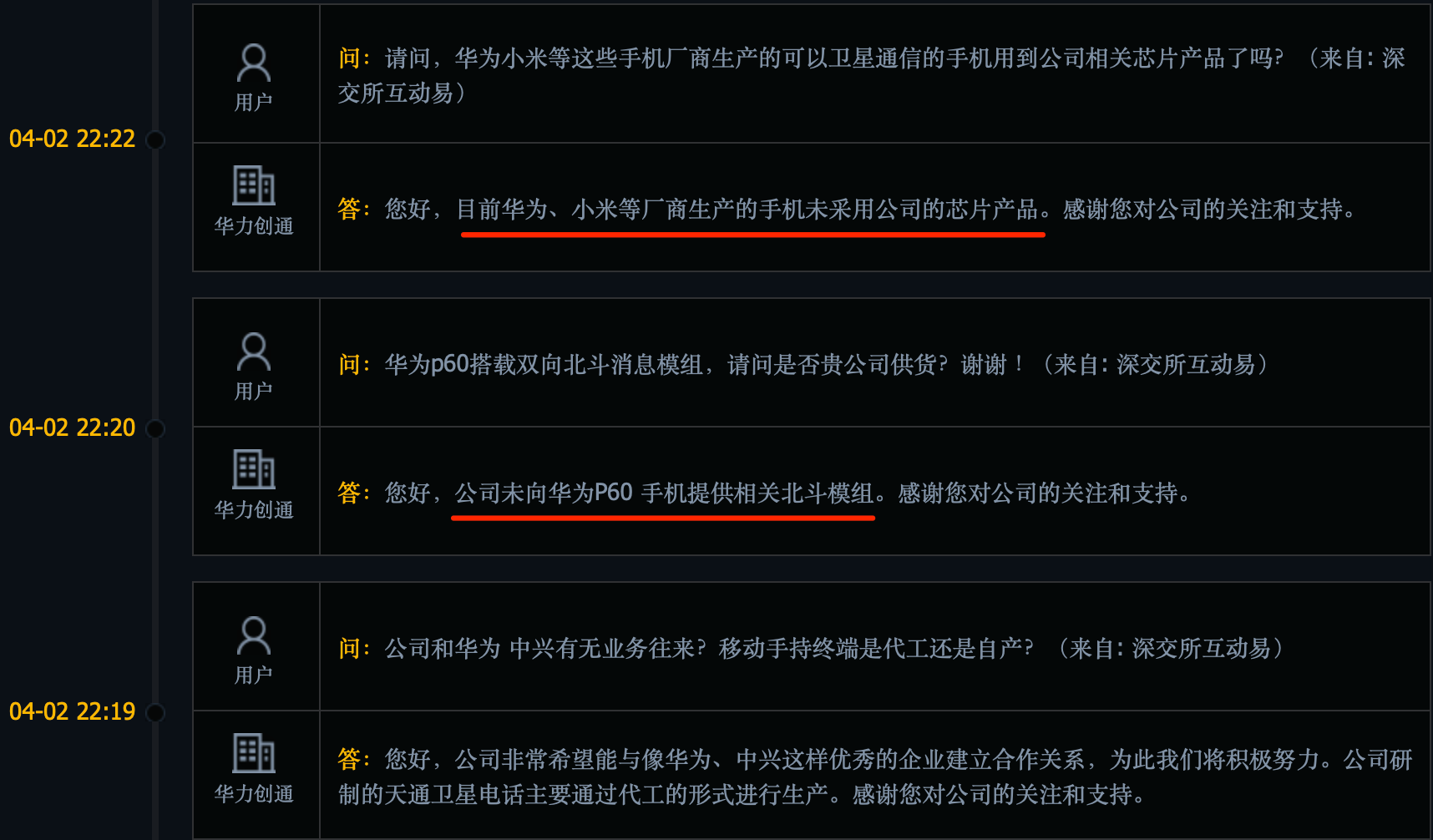 回溯更早的回复动态,界面新闻注意到,4月份时,华力创通曾在互动平台表示“目前华为、小米等厂商生产的手机未采用公司的芯片产品”,以及“公司未向华为P60 手机提供相关北斗模组”。