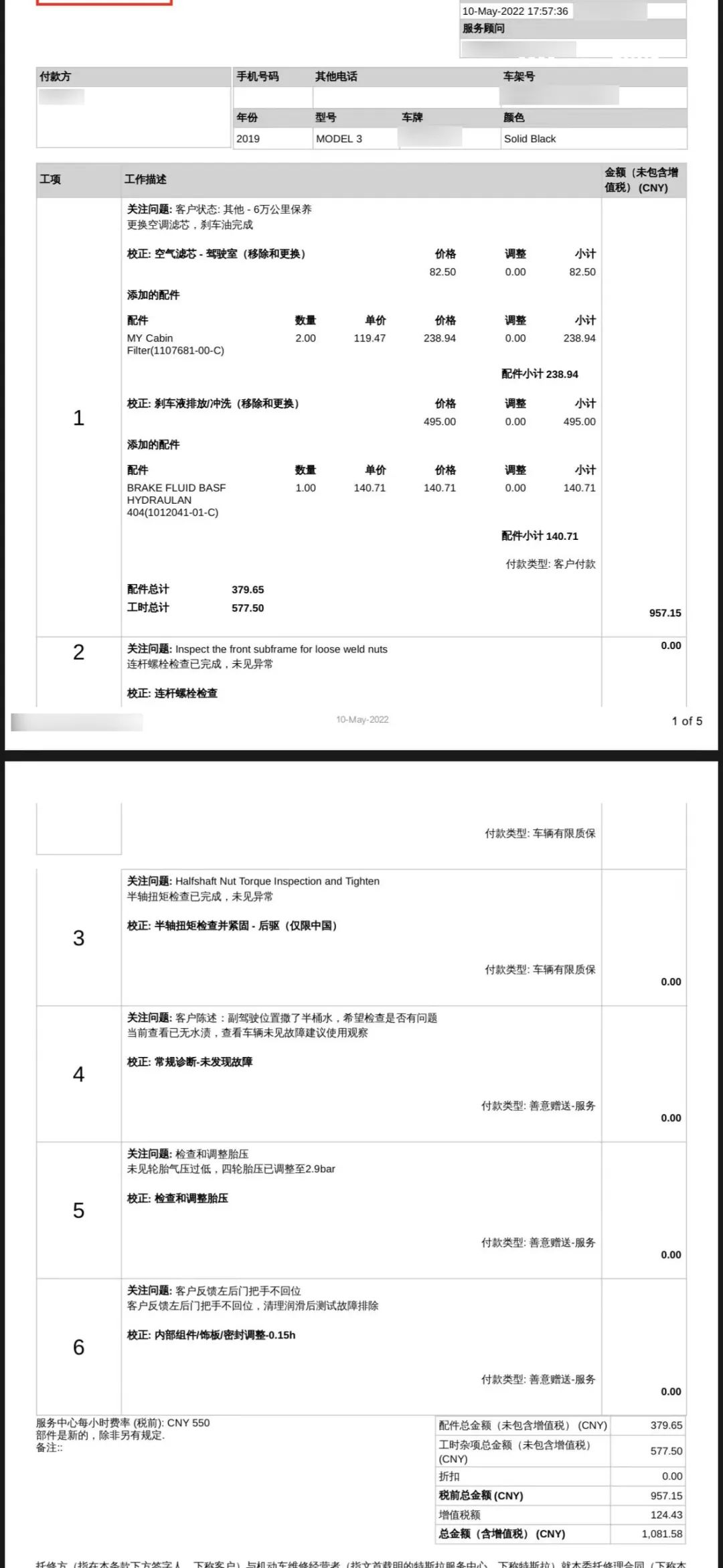 4年8万公里的Model 3,最贵的一次保养1081元,6万公里保养