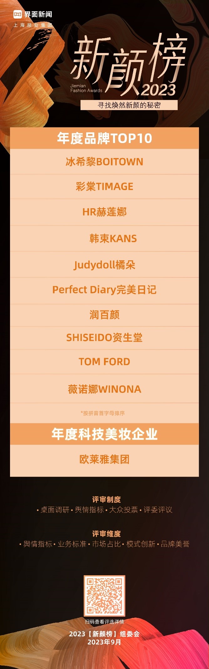 由上海报业集团 | 界面新闻主办的2023【新颜榜】评选终榜于9月7日【时尚力盛典】正式揭晓,盛典现场公布了年度品牌 TOP10以及年度科技美妆企业单项奖,并为上榜品牌及企业颁发荣誉。自评选启动以来,【新颜榜】便有幸吸引了了业界、专家、媒体和广大消费者的热切关注。我们始终秉持着公正、客观的原则,竭诚评选出那些在美妆领域内卓越表现、口碑持续赞誉的品牌。通过这一榜单的推出,我们坚定地传递着当代正确的美丽观,努力促进美妆产业的持续进步和价值观的树立,这正是【新颜榜】的初心与使命。
