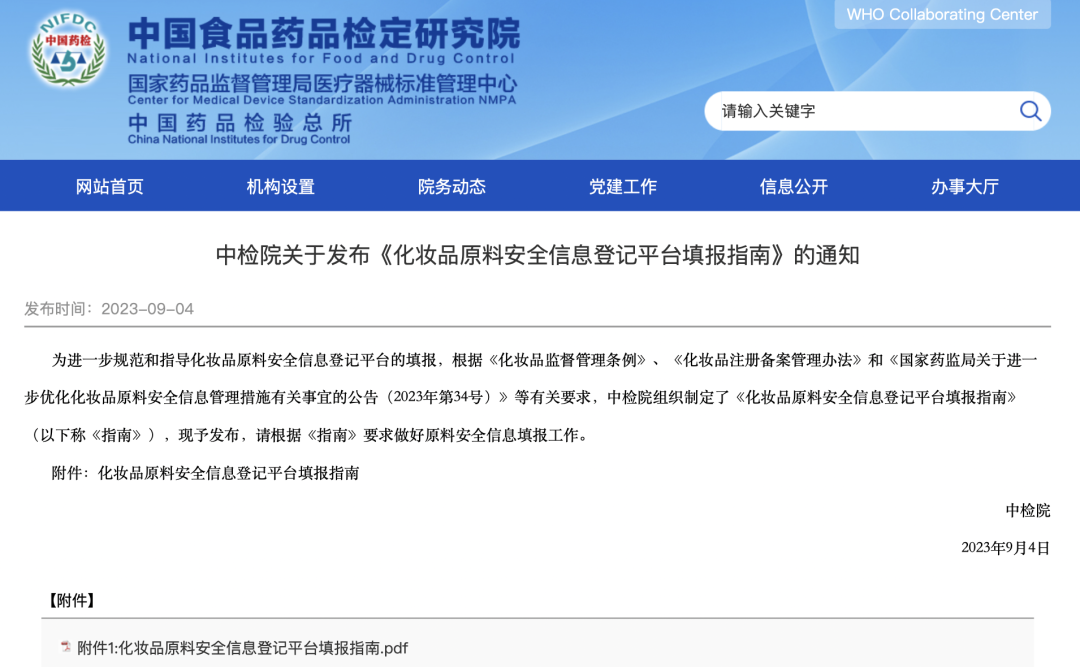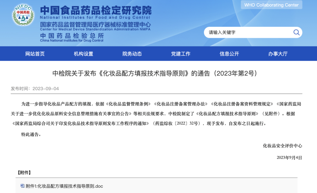 9月4日,中国食品药品检定研究院发布《化妆品原料安全信息填报技术指导原则》(以下简称《原料安全填报导则》)《化妆品配方填报技术指导原则》(以下简称《配方填报导则》)两项通告和《化妆品原料安全信息登记平台填报指南》(以下简称《填报指南》)的通知,且相关内容即日施行。