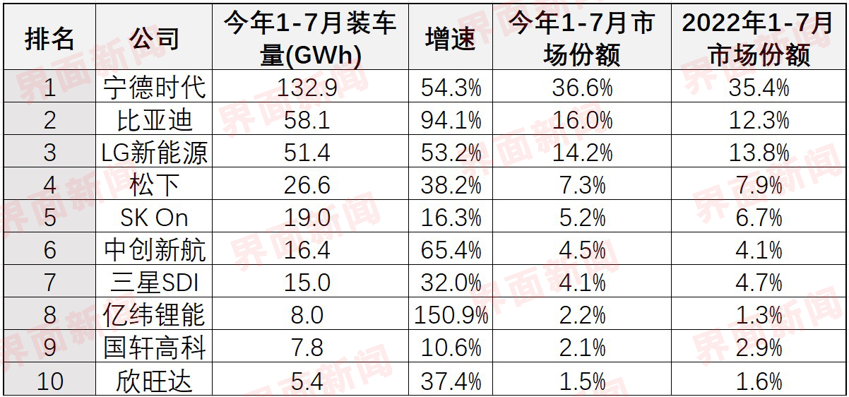 在位居前十的动力电池企业中,六家中国企业今年1-7月的总市场份额达62.9%,去年同期这个数字为57.6%。
