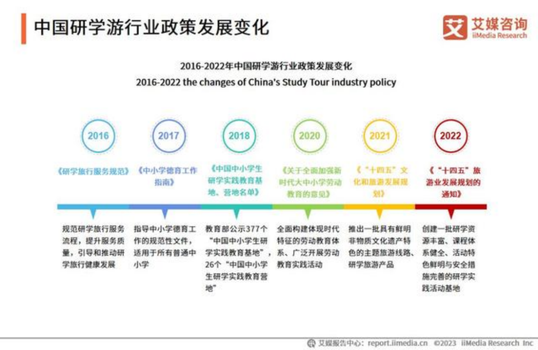 2016年,教育部等11部门联合发布《关于推进中小学生研学旅行的意见》,提出将研学旅行将纳入教学计划,与综合实践活动课程统筹考虑,促进研学旅行和学校课程有机融合。2017年教育部发布《中小学综合实践活动课程指导纲要》,明确包括研学旅行在内的综合实践活动,是国家义务教育和普通高中课程方案规定的必修课程,与学科课程并列设置。自此,在一系列的政策推动下,研学游逐渐走入人们视野,成为中小学生的“人生必备经验”。