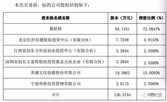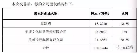 美盛文化12月8日晚间公告宣布,美盛控股近期与深圳市同道大叔文化传播有限公司签署股权转让协议。美盛控股以人民币21,750万元向蔡跃栋、红杉、创东方、明侨投资(黄晓明旗下基金)收购其持有同道文化72.5%的股权。