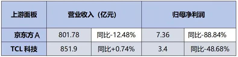 面板作为电视终端的上游产业链一部分,其价格涨跌也直接影响了电视的售价。从电视面板主要厂商业绩来看,上半年,TCL科技与京东方A业绩均呈下滑态势,二者分别实现营收851.9亿元、801.78亿元;实现归母净利润3.4亿元、7.36亿元,分别同比下滑48.68%、88.84%。