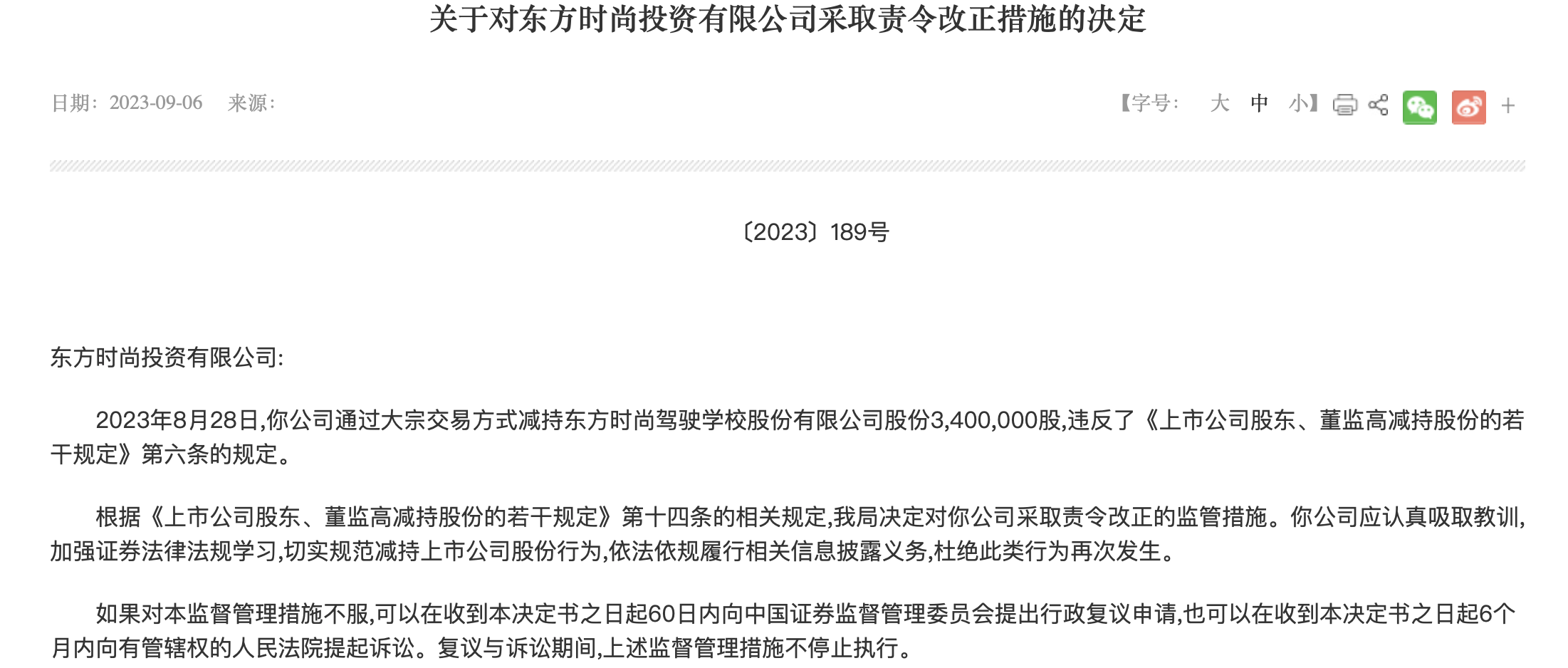 北京证监局决定对东方时尚投资采取责令改正的监管措施,认为东方时尚投资于8月28日通过大宗交易方式减持东方时尚股份340万股的行为,违反了《上市公司股东、董监高减持股份的若干规定》第六条的规定。