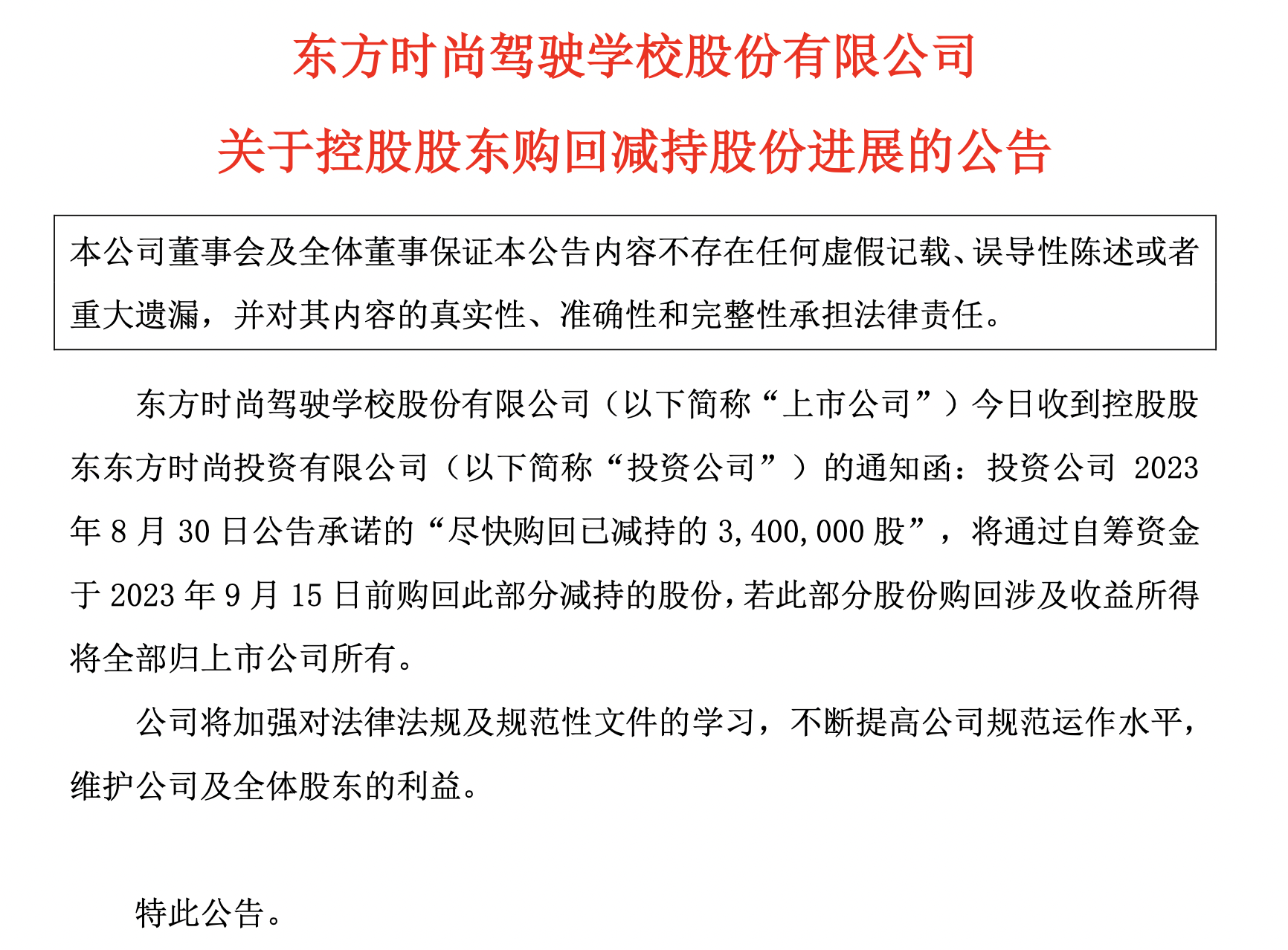 东方时尚表示,今日收到控股股东东方时尚投资的通知函,其将通过自筹资金于9月15日前购回此部分减持的股份,若此部分股份购回涉及收益所得将全部归上市公司所有。公司将加强对法律法规及规范性文件的学习,不断提高公司规范运作水平,维护公司及全体股东的利益。