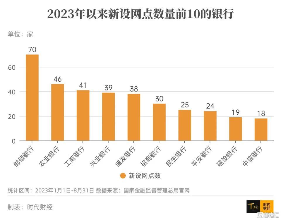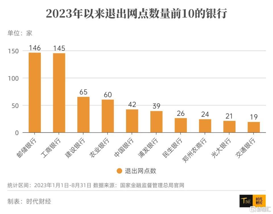 时代财经根据国家金融监督管理总局官网披露的数据统计得出,2023年以来(截至8月31日),邮储银行与工商银行撤点最多,分别为146家和145家;其次则是建设银行、农业银行,分别为65家与60家。
