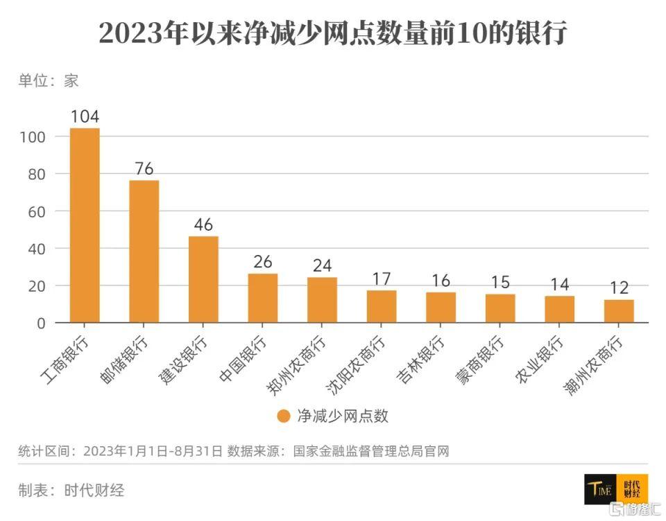根据时代财经统计数据,2023年以来(截至8月31日),工商银行净减少网点数量达到104家,其次是邮储银行、建设银行、中国银行,分别净减少76、46、26家。