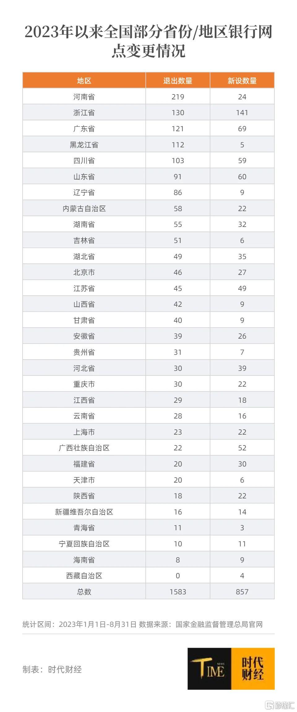 根据国家金融监督管理总局官网披露的数据,时代财经对2023年以来(截至8月31日)退出的银行网点(包括支行、分理处、服务点、储蓄所、营业所,不包括村镇银行与信用社)进行了相关统计。