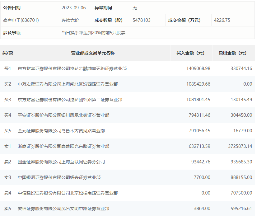 9月6日,豪声电子今日涨9.19%,龙虎榜数据显示,上榜营业部席位全天成交1353.39万元,占当日总成交金额比例为32.02%。其中,买入金额为589.94万元,卖出金额为763.45万元,合计净卖出173.52万元。