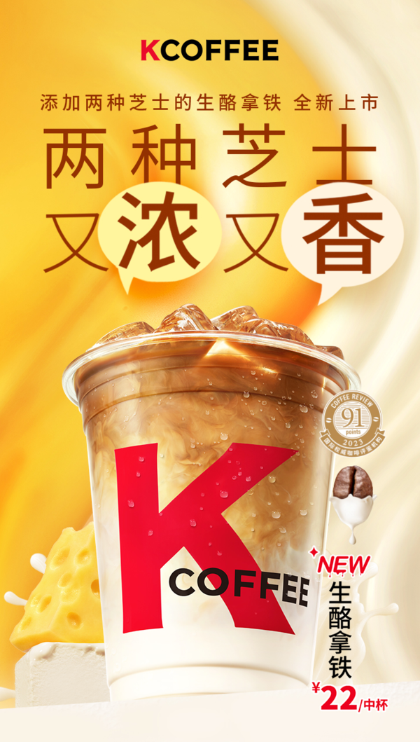 9月4日,肯德基新品生酪拿铁上市。新款生酪拿铁添加两种芝士,分别为欧洲浓醇芝士和新西兰奶油干酪,配方新升级,选用100%阿拉比卡咖啡豆,新鲜现磨。官方售价22元/中杯,还有指定现磨奶咖系列买一送一活动。(品牌官方)