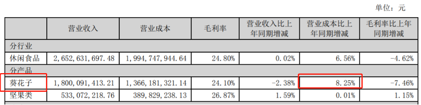 半年报显示,葵花子产品营收从去年同期的18.44亿元下降至18.00亿元,降幅为2.38%,营收占比从68.86%下降至67.02%。