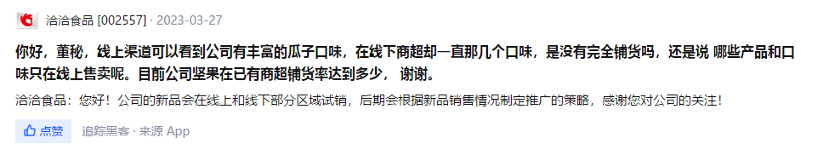 在投资者平台上,有人发问:“线上渠道可以看到公司有丰富的瓜子口味,在线下商超却一直那几个口味,是没有完全铺货吗?”