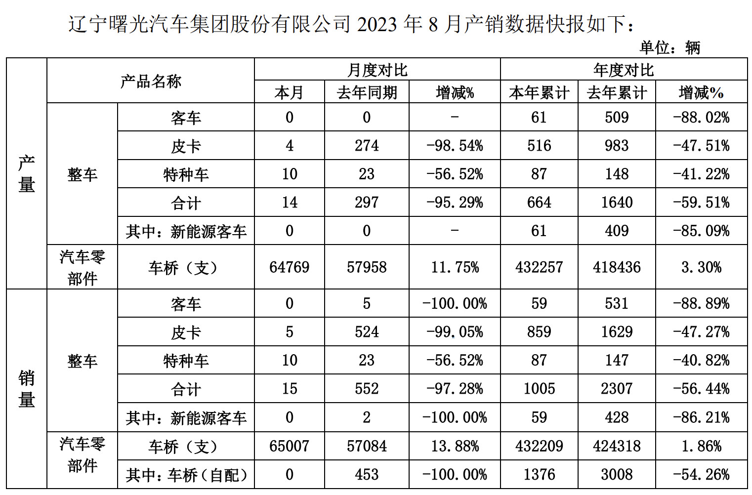 ST曙光9月6日公布8月产销数据快报,8月整车销量合计15辆,同比下降97.28%;汽车零部件车桥销量65007支,同比增长13.88%。前8月整车销量合计1005辆,同比下降56.44%;汽车零部件车桥销量432209支,同比增长1.86%。