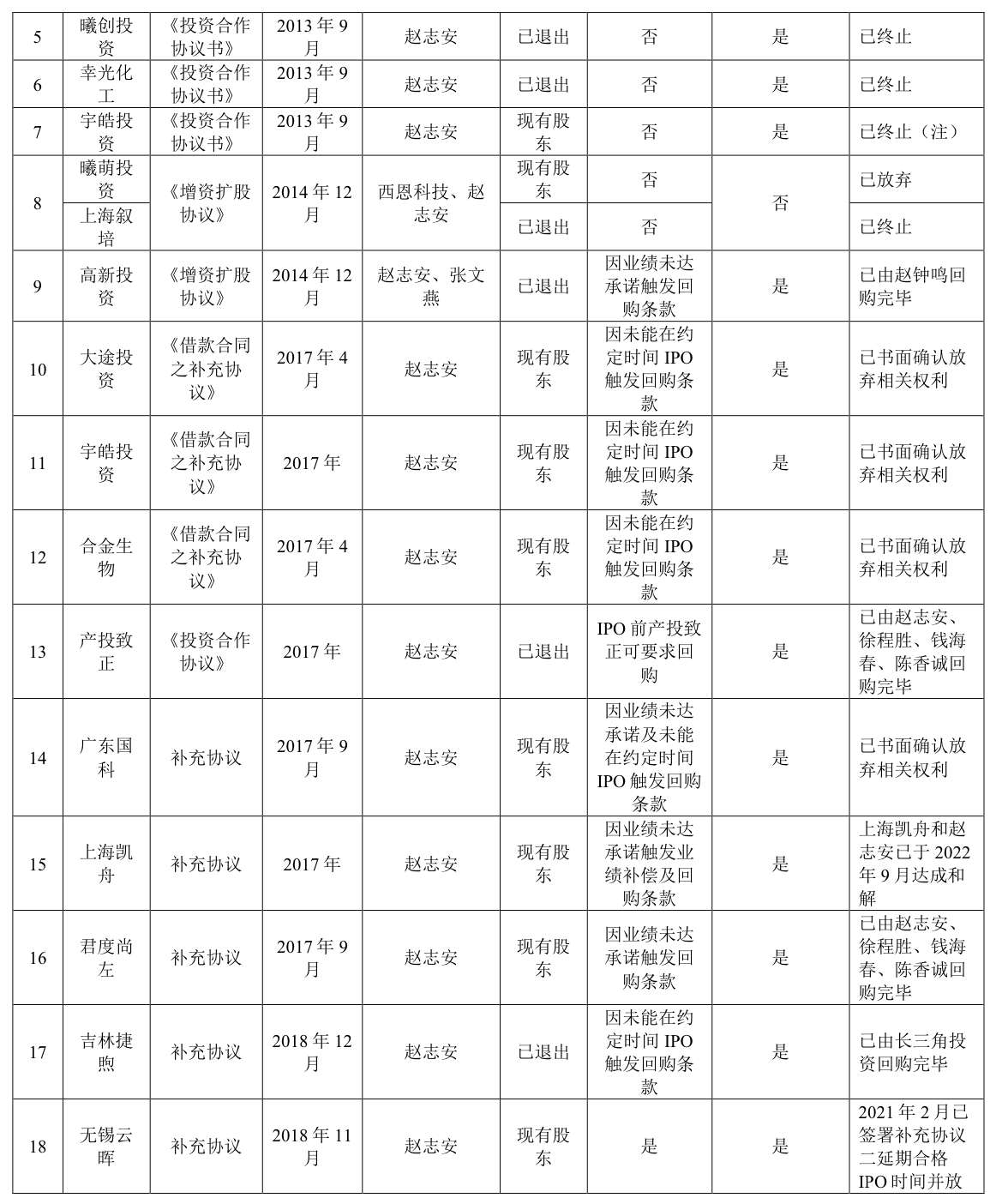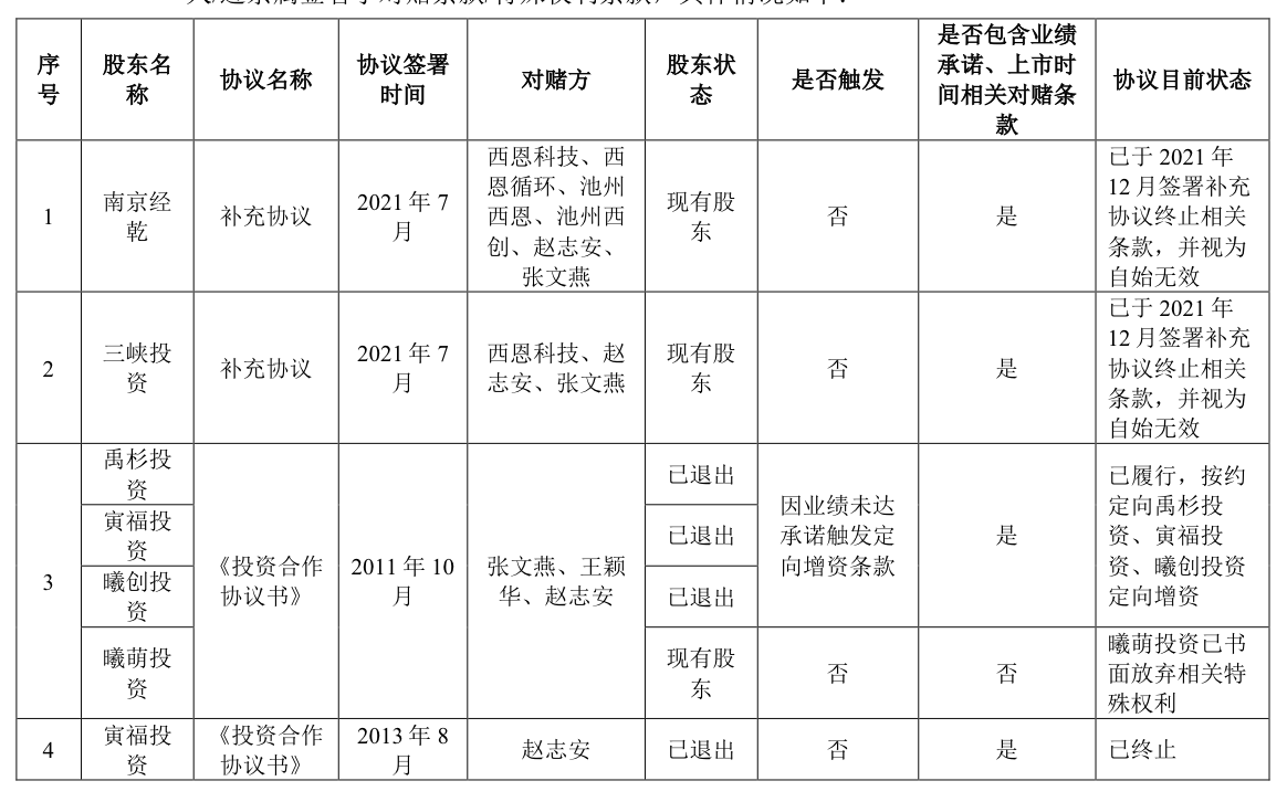 由上表可知,南京经乾、三峡投资已签署补充协议确认对赌条款均已解除,且视为自始无效;广东国科、大途投资、宇皓投资、合金生物和曦萌投资5家投资机构已书面确认放弃相关权利;君度尚左补充协议已执行完毕;上海凯舟已和赵志安达成和解;两江投资、共青城投资、苏州云晖、广东弘德、招华招证、中金传化、嘉兴隽绵、青岛上汽、长三角投资和无锡云晖10家股东协议已自动解除;9名历史股东已不再持有西恩科技股份。西恩科技表示,公司历史上签订的对赌协议(或类似安排)不存在潜在纠纷,公司实际控制人及一致行动人就对赌协议(或类似安排)不存在潜在大额债务。