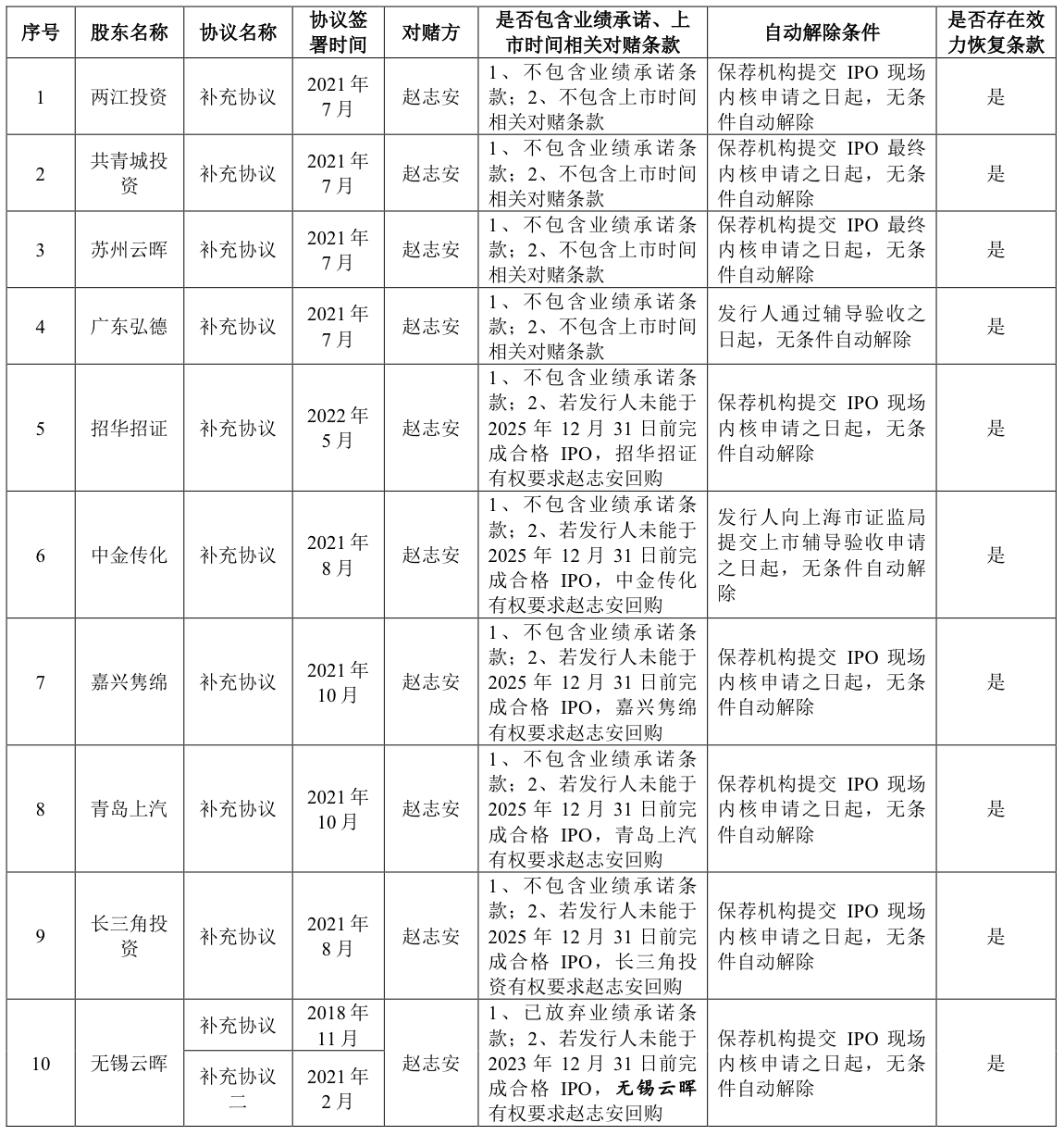 比如招华招证、中金传化、嘉兴隽绵、青岛上汽、长三角投资的条款就提及,若公司未能于2025年12月31日前完成合格IPO,招华招证有权要求赵志安回购;而无锡云晖的条款是,若公司未能于2023年12月31日前完成合格IPO,无锡云晖有权要求赵志安回购。如此看,如何应对无锡云晖有可能的回购要求,是西恩科技接下来需要思考的问题。