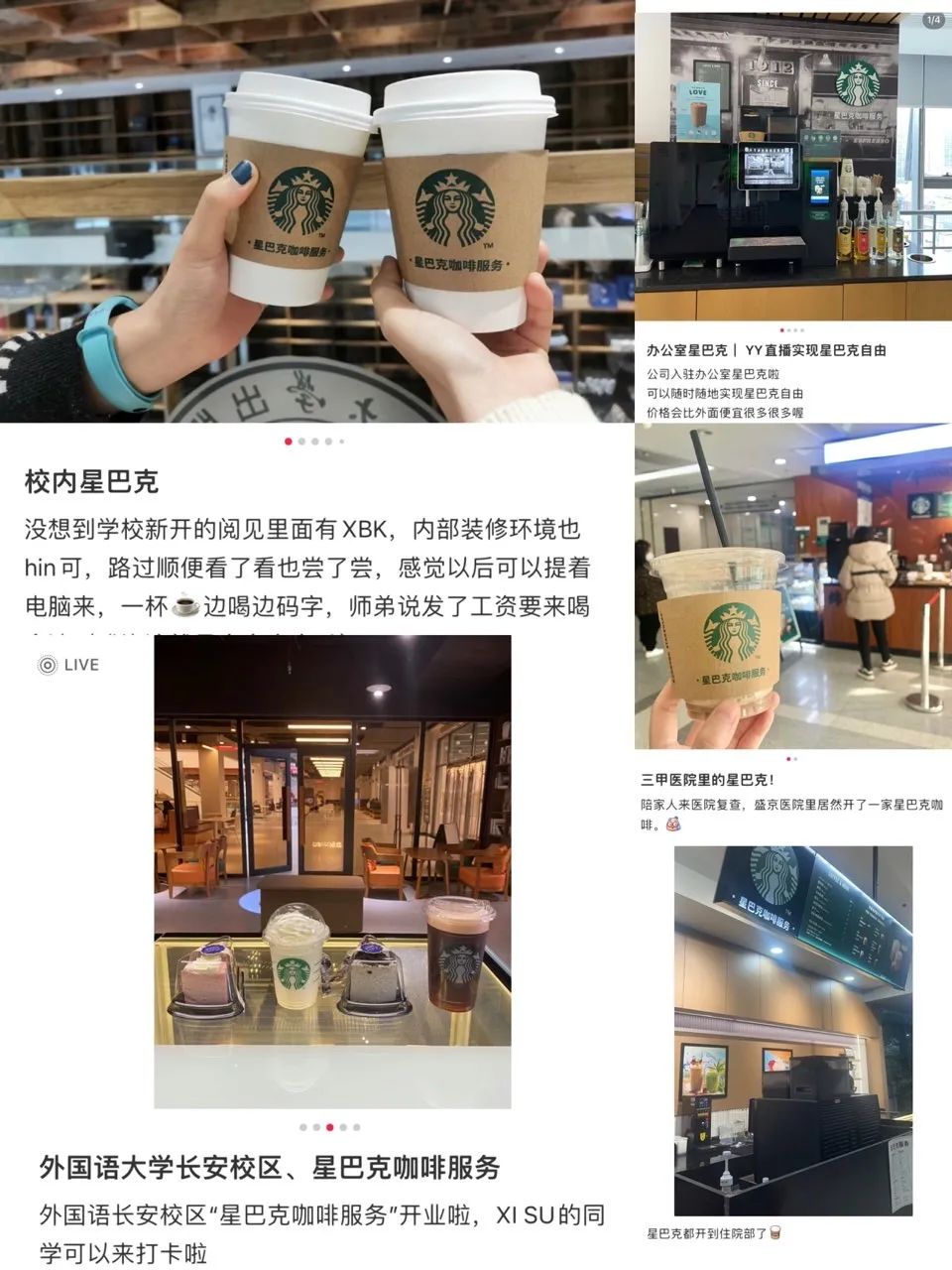 今天,小食代在社交媒体上看到,不少网友也曾围绕身边的“星巴克咖啡服务”发表讨论。例如,有多地的网友晒出“学校里开星巴克”的图片,也有在公司的打工人、在医院看病的网友晒出了他们见到的星巴克饮品——在星巴克标识下方的显著位置均可见到“星巴克咖啡服务”字样。