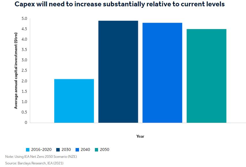 到2050年,想要实现净零排放目标的绿色转型,则需要对世界能源、运输和工业系统进行全面改革,并转变农业和林业行为。这将需要大量的投资——远远超过目前世界所能提供的。巴克莱分析师列出了该领域投资需求的三个关键方面。