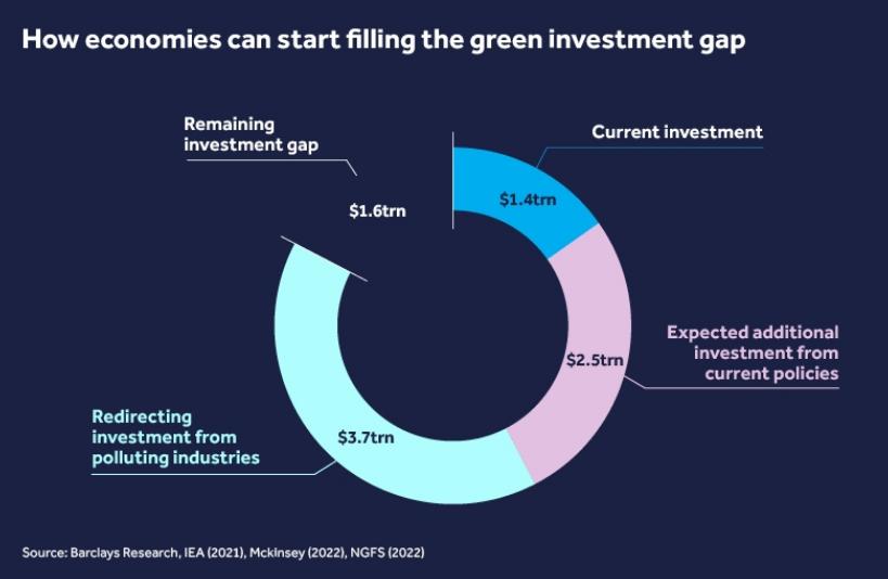 这使得每年的投资缺口达到约5.3万亿美元,这一缺口数额仍然很大。但这一问题可以通过将目前流入棕色基础设施(brown infrastructure)的约3.7万亿美元资金转向绿色发电厂来进一步得到解决,这一部分基础设置指的是例如高污染的石油和天然气开采、提炼和燃烧、水泥和钢铁生产等。