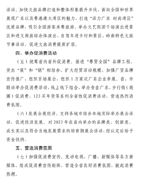 9月6日,广东省商务厅、广东省财政厅、广东省文化和旅游厅发布关于印发促消费专项行动政策措施的通知。其中提出,延续《广东省加大力度持续促进消费若干措施》的做法,各地市采取企业让利一点、政府支持一点的激励政策,对消费者购买各类音像器材、家用厨房电器具、小家电、制冷电器、清洁电器、洗涤电器、保健电器、电脑、手机九大类家用电器给予补贴。省对各市(不含深圳市)在2023年7月1日至12月31日期间活动实行奖补政策,补贴比例和标准另行制定。