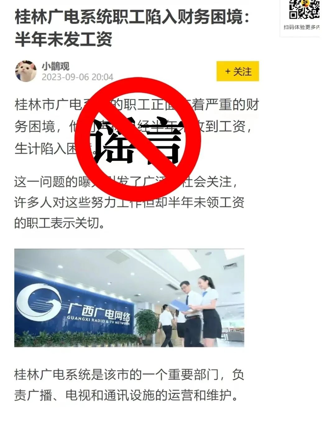 9月7日,桂林市互联网信息办公室通过桂林广播电视台旗下微信公众号发文辟谣称:近日,网络传播一则声称桂林广电系统职工陷入财务困境,半年未发工资的信息,经核查,此信息失实。请大家不信谣不传谣。我办保留追究编发失实信息人员法律责任的权利。
