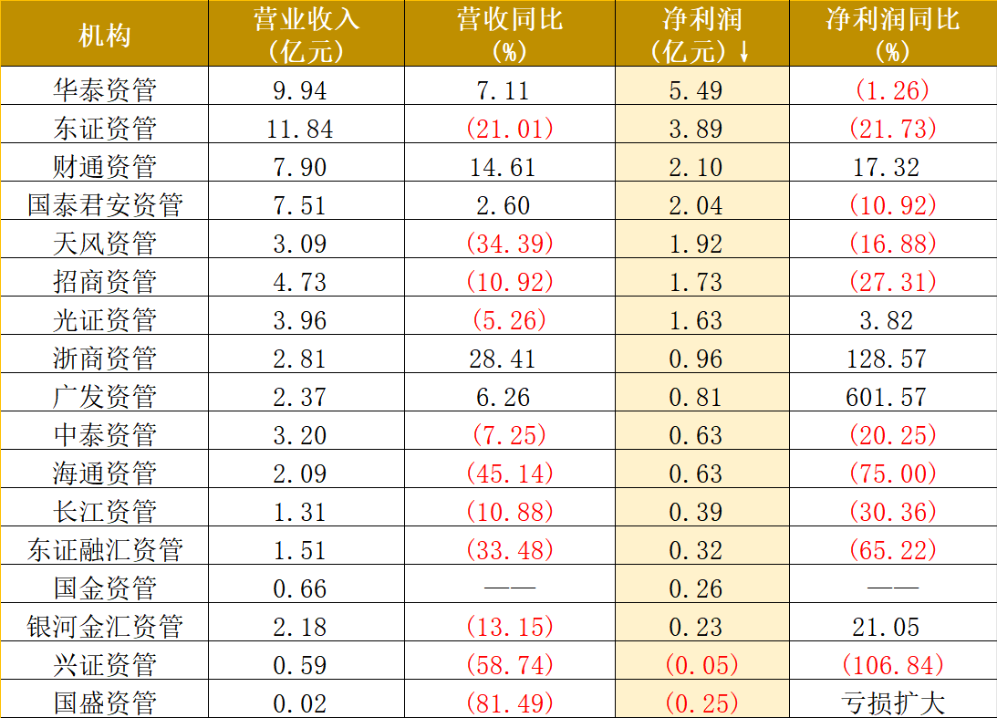其中,华泰资管再居净利润榜首位,达到5.49亿元,同时营收同比增长7.11%至9.94亿元;排位第二的东证资管虽营收高达11.84亿元,但净利润仅3.89亿元。