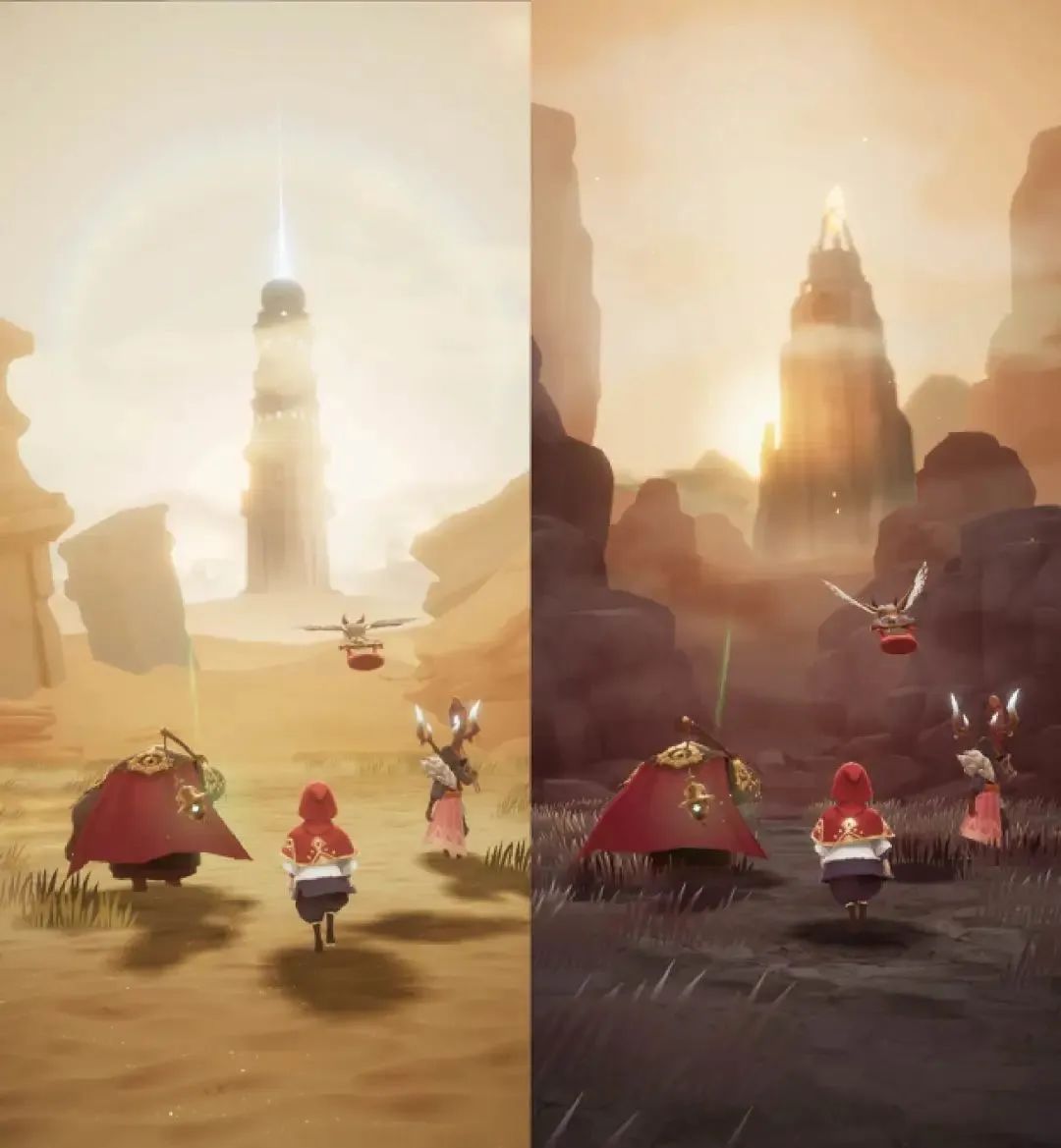 美术治愈、温暖、简洁,呈现风格化。《光之境》采用《光·遇》风格,画面简洁,治愈风的美术包装,对于没有玩过《光·遇》的玩家可以说眼前一亮。这种治愈、温暖、简洁的风格,较为符合亚太地区玩家审美,特别是韩国。即使在全球市场,也可以立足之地——治愈系风格化的优势。