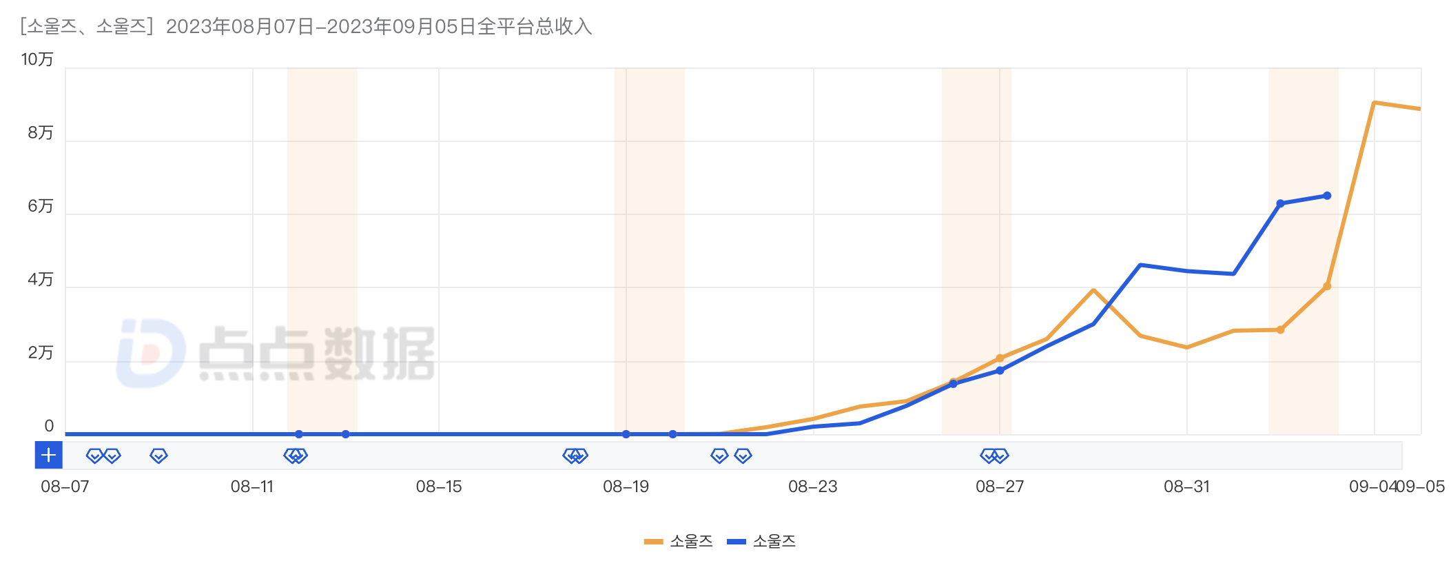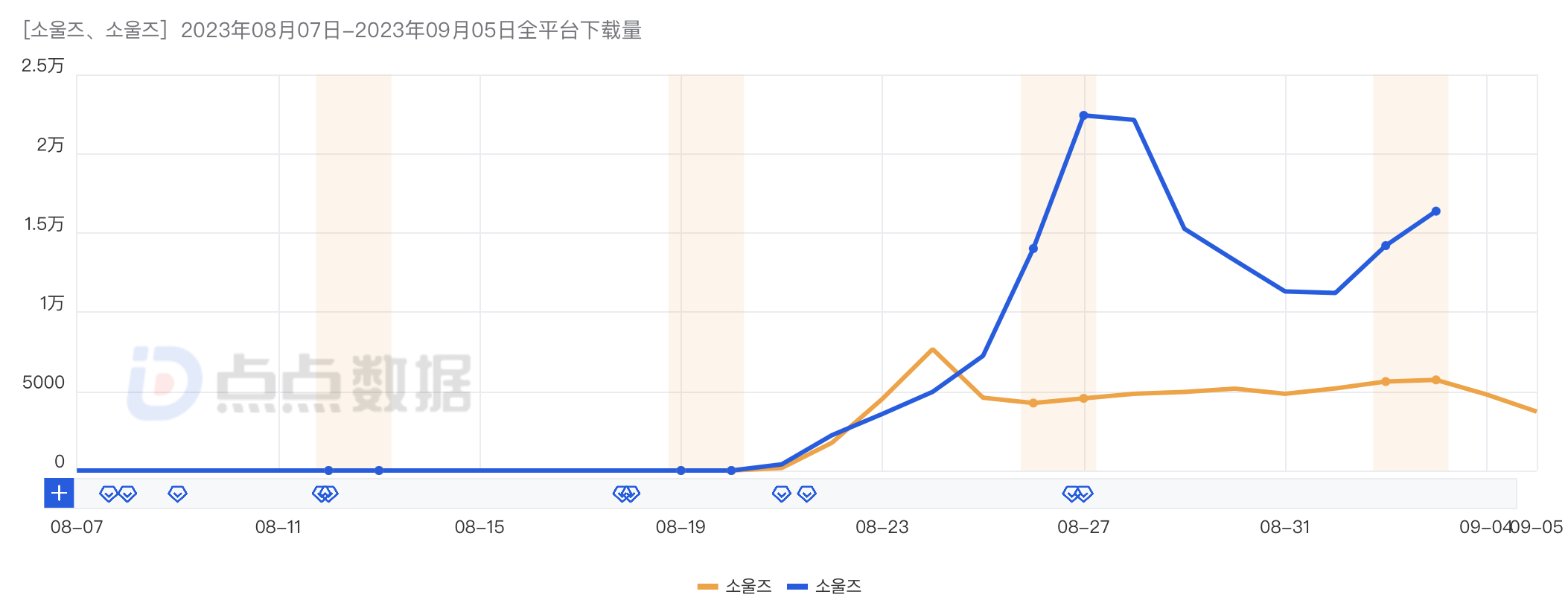 下载量方面,该游戏预估下载从8月22日开始迎来上升期,并且在27号达到顶峰,谷歌单日预估下载量突破16万次,累计下载超203万次。其中,韩国市场双端贡献23万次。(下图蓝线为谷歌,橙线为苹果,维度为全球市场)