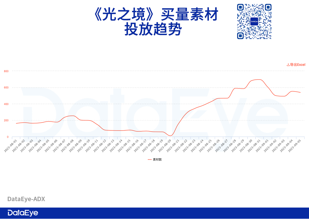 从投放素材总量来看,DataEye-ADX海外版数据显示,截止到9月5日,《光之境》近30天日均投放素材越500组,去重素材量(创意量)已达到1665组。