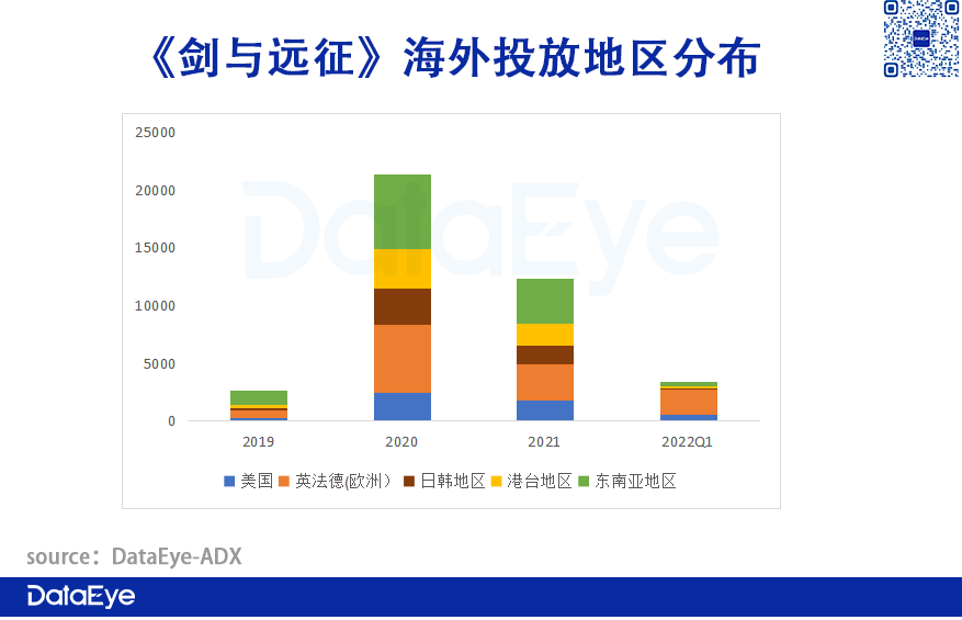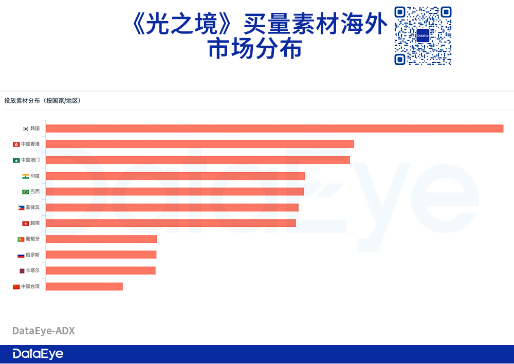 在投放市场方面,《光之境》是采用“包场式”营销,几乎每个市场都投,并且重点投放在日韩、中国港台、东南亚等市场。意在通过素材投放,去寻找核心用户所在地——不确定哪些市场能成,干脆用钱砸出一个答案。