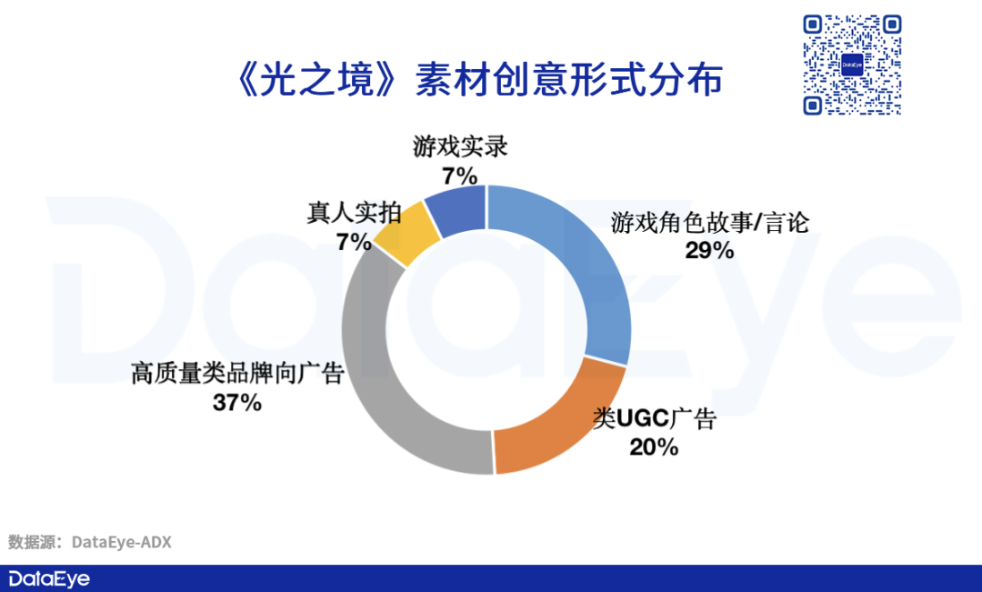 《光之境》TOP50高效素材,主要以“品牌向”、“游戏角色故事/言论”素材为主,合计占比超65%。此外,各类素材该游戏均有尝试性投放,但占比不高。