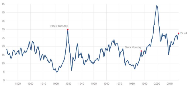 市场观察人士上个月底指出,“席勒市盈率”目前处在27倍以上。美国股市这一指标过去超过该水平分别是在1929年市场狂热、2000年科技泡沫和2007年房地产及股市泡沫期间。