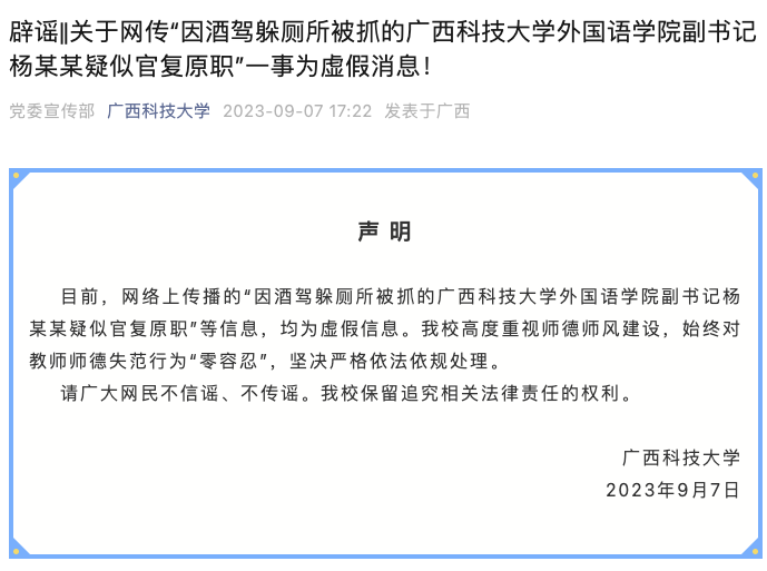 广西科技大学9月7日发布声明,目前,网络上传播的“因酒驾躲厕所被抓的广西科技大学外国语学院副书记杨某某疑似官复原职”等信息,均为虚假信息。学校高度重视师德师风建设,始终对教师师德失范行为“零容忍”,坚决严格依法依规处理。请广大网民不信谣、不传谣。学校保留追究相关法律责任的权利。