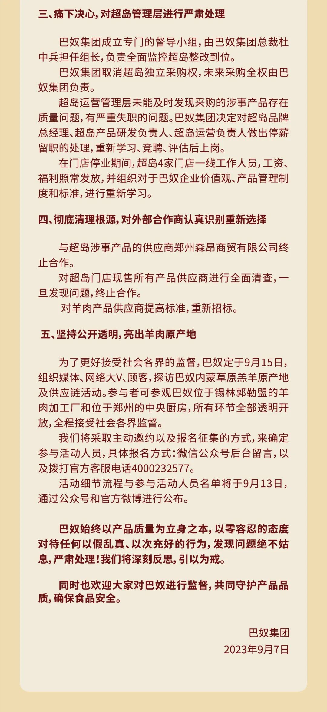 此外,巴奴集团取消超岛独立采购权,未来采购全权由巴奴集团负责。巴奴集团决定对超岛品牌总经理、超岛产品研发负责人、超岛运营负责人做出停薪留职的处理,重新学习、竞聘、评估后上岗。在门店停业期间,超岛4家门店一线工作人员,工资、福利照常发放。
