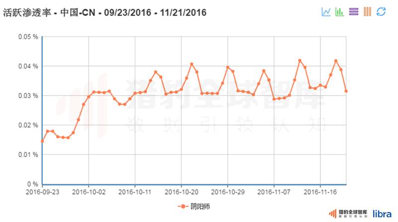 通过libra数据可以看出,阴阳师的用户的二次元游戏特性极强,观察9.23-11.21期间阴阳师日活跃渗透率,阴阳师的用户周末活跃度明显高于工作日,并展示出了长期的规律性,玩家与二次元用户的游戏习惯高度一致。