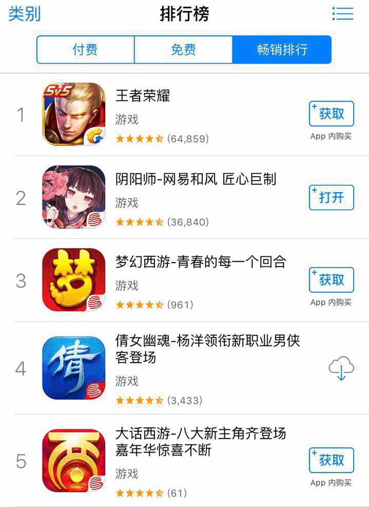 目前阴阳师在appstore畅销榜中依然位居前2,纵观iOS平台游戏畅销榜Top5王者荣耀之后的2-5位游戏均出自网易之手,面对网易群狼的追赶,王者荣耀布置是否感觉到了孤立无援的威胁呢?