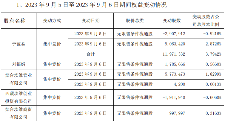 于范易等人的减持主要发生在9月6日。公告显示,9月5日于范易减持290.79万股约占总股本的0.92%;9月6日于范易等人合计减持1953.25万股,约占总股本的6.2%。