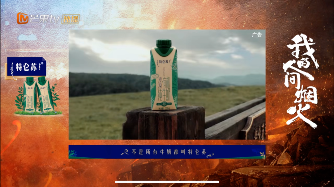 而作为金鹰独播剧场冠名的特仑苏,也在各种位置、以多种形式,出现在播出剧集的广告中。比如在前不久金鹰独播剧场播出的《我的人间烟火》中,特仑苏以脚标形式出现在右下角,同时,又在片头或中插位置有所曝光。当然,除此之外,最常见的植入方式,冠名者没有缺席。