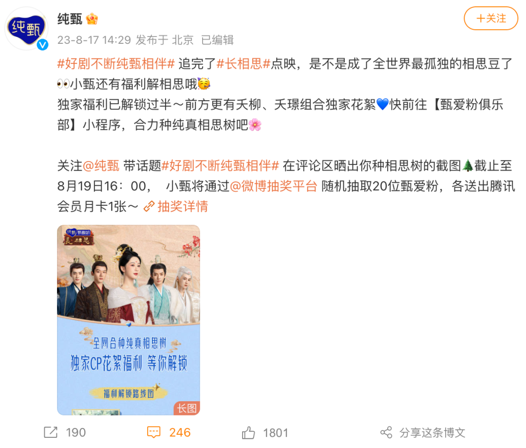 同时,《长相思》还推出合种“纯甄相思树”,解锁独家花絮的活动,在腾讯视频站内点击后直接跳转纯甄甄爱粉俱乐部,蓝色的纯甄带上了红色凤凰花树的浪漫。